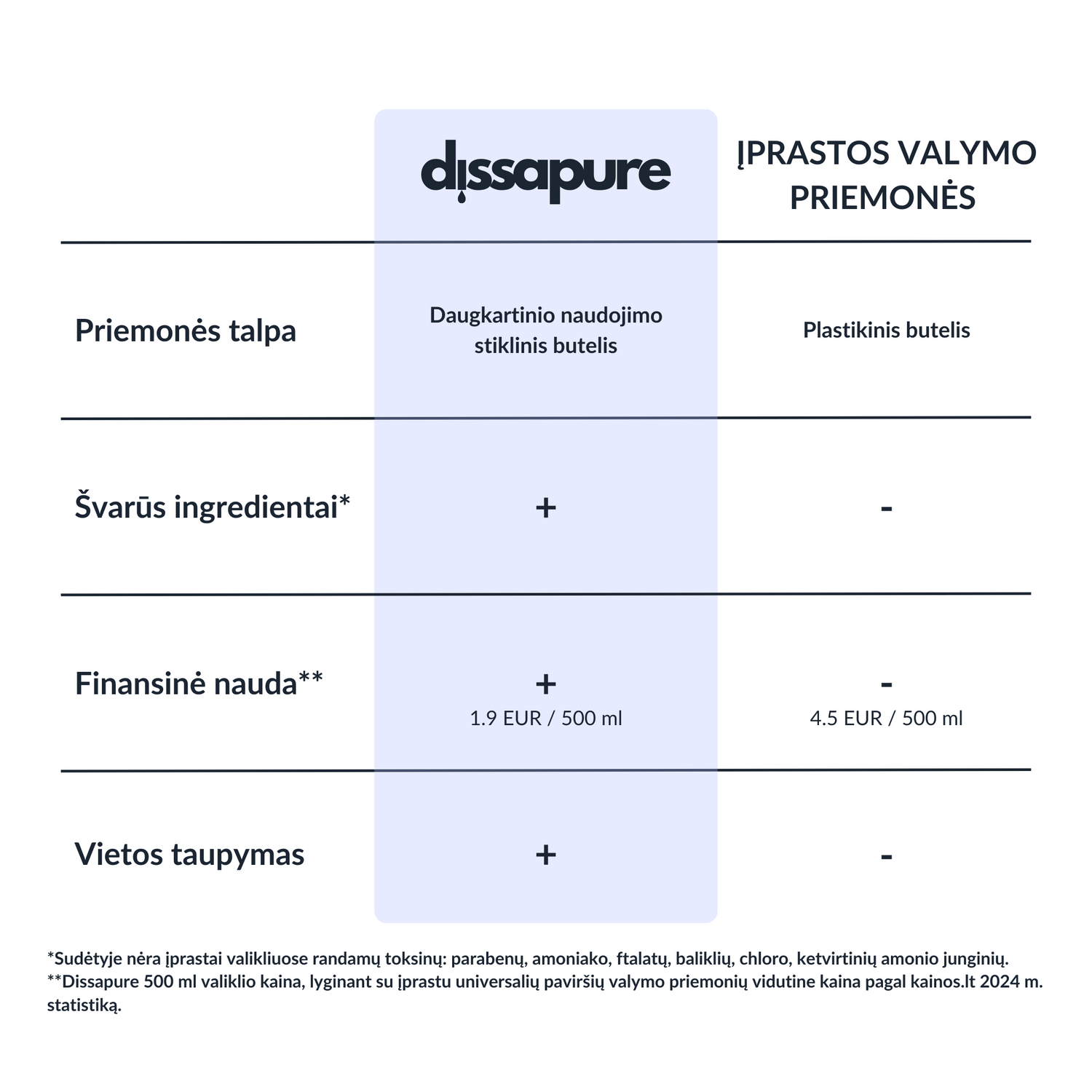 Dissapure namų priežiūros priemonių sudėtyje dominuoja natūralios kilmės ingredientai, užtikrinantys efektyvų valymo rezultatą. Sudėtyje nėra įprastų valiklių toksinų, tokių kaip: parabenų, fosfatų, amoniako junginių, chloro baliklių ir ftalatų.