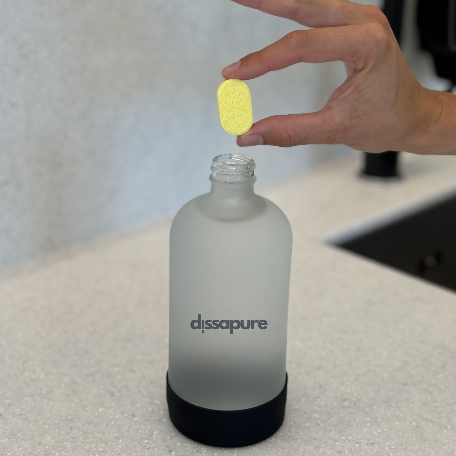 - Pripildykite 500 ml šilto (ne verdančio) vandens į Dissapure buteliuką.